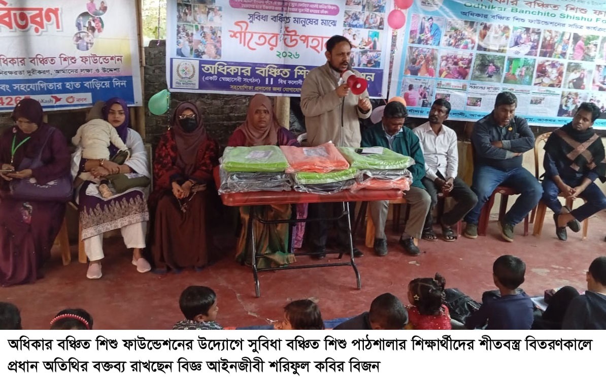 চট্টগ্রামের অধিকার বঞ্চিত শিশু ফাউন্ডেশনের উদ্যোগে আজ ১২ জানুয়ারি, সোমবার, বিকাল পাঁচটায় নগরীর লেকসিটি হাউজিং সোসাইটির অধিকার বঞ্চিত শিশু পাঠশালার সুবিধাবঞ্চিত শিক্ষার্থীদের মাঝে শীতবস্ত্র বিতরণ করা হয়।