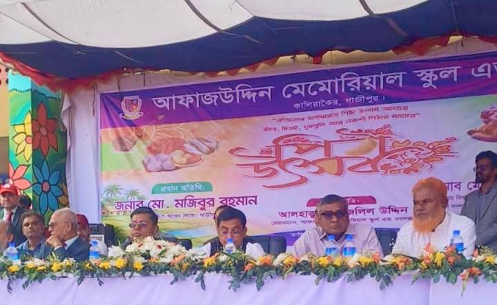 আফাজউদ্দিন মেমোরিয়াল স্কুল এন্ড কলেজের চেয়ারম্যান আলহাজ্ব মোঃ জলিল উদ্দিন এর সভাপতিত্বে পিঠা উৎসবে প্রধান অতিথি হিসেবে উপস্থিত ছিলেন, গাজীপুর -১ আসনে নব নির্বাচিত সংসদ সদস্য মোঃ মজিবুর রহমান, অনুষ্ঠানে শুভ উদ্বোধন করেন, বিএনপির কেন্দ্রীয় কমিটির শ্রম বিষয়ক সহ সম্পাদক মোঃ হুমায়ুন কবির খান, উপস্থিত ছিলেন, আফাজউদ্দিন মেমোরিয়াল স্কুল এন্ড কলেজের অধ্যক্ষ মোঃ দেলোয়ার হোসেন সহ শিক্ষক -শিক্ষিকামন্ডলী সহ অবিভাবক ও ছাত্র-ছাত্রী বৃন্দ।