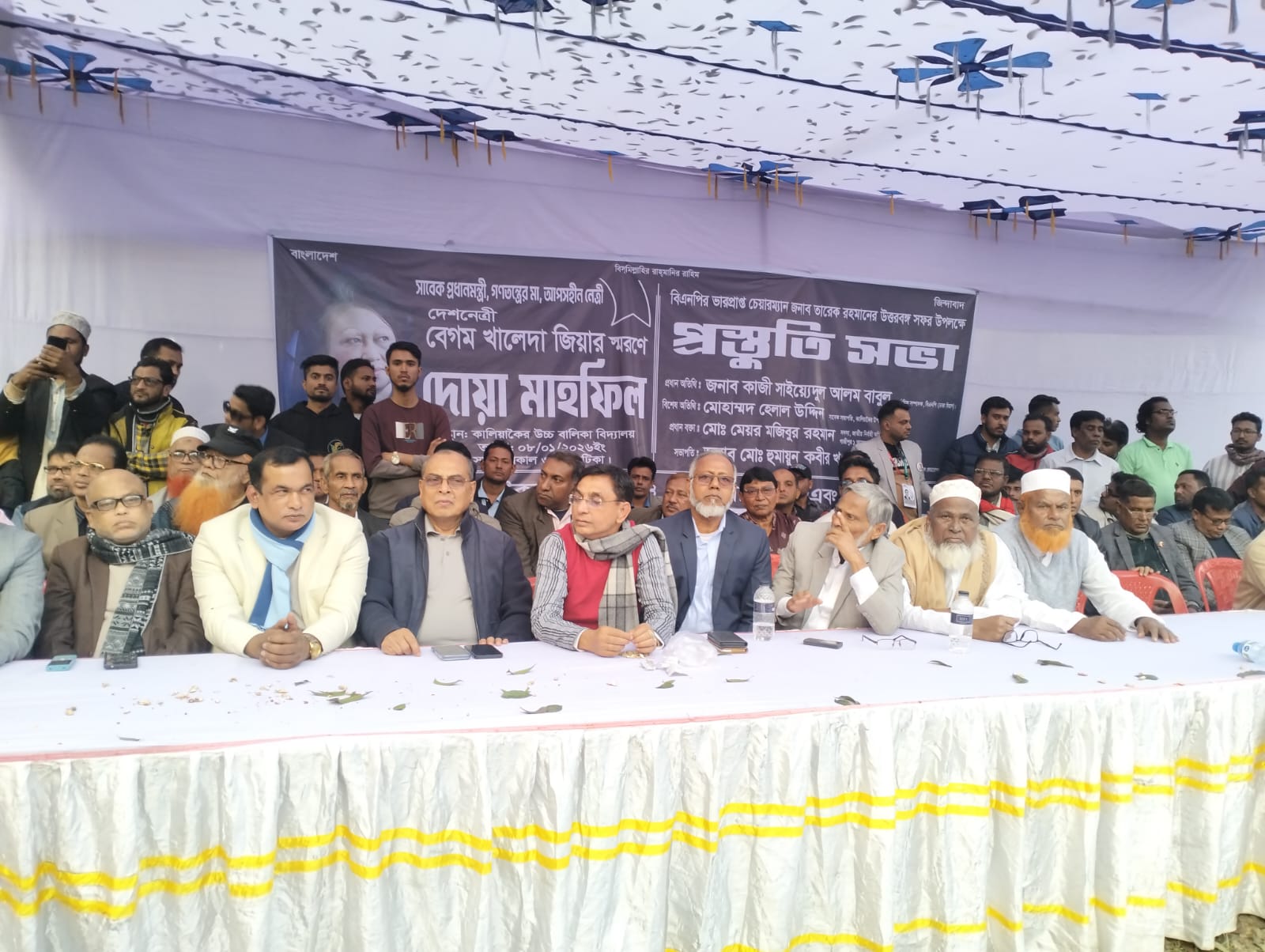 গাজীপুরের কালিয়াকৈরে বেগম খালেদা জিয়া স্মরণে দোয়া মাহফিল অনুষ্ঠিত হয়েছে। গতকাল বিকেলে উপজেলার কালিয়াকৈর উচ্চ বালিকা বিদ্যালয়ের মাঠে কালিয়াকৈর বিএনপির আয়োজনে এ স্মরণ সভা ও দোয়া মাহফিল অনুষ্ঠিত হয়েছে।কেন্দ্রীয় বিএনপির সহ শ্রম বিষক সম্পাদক হুমায়ুন কবির খানের সভাপতিত্বে প্রধান অতিথি হিসেবে উপস্থিত থেকে বক্তব্য রাখেন ঢাকা বিভাগের বিএনপি সংগঠনিক সম্পাদক কাজী সাইয়েদুল আলম বাবুল, কালিয়াকৈর উপজেলা বিএনপির সাবেক সভাপতি ভিপি হেলাল উদ্দিন, উপজেলা পরিষদের সাবেক চেয়ারম্যান আব্দুল লতিফ, উপজেলা বিএনপির সাবেক সাধারণ সম্পাদক পারভেজ আহমেদ প্রমূখ, এ সময় বক্তারা বলেন, গাজীপুর ১ আসনের ধানের শীষের প্রার্থীর পক্ষে সবাই ঐক্যবদ্ধ। আগামী ১২ ই ফেব্রুয়ারি সংসদ নির্বাচনে গাজীপুর ১ আসনে ধানের শীষ কে বিপুল ভোটে বিজয়ী করার প্রতিজ্ঞা করেন। এ বিষয়ে সবাইকে ঐক্যবদ্ধ হয়ে এক যুগে ধানের শীষের পক্ষে কাজ করার জন্য সকল সকল নেতা কর্মীকে অনুরোধ করেন। প্রধান বক্তা হিসেবে উপস্থিত থেকে গাজীপুরে এক আসনের ধানের শীষের মনোনীত প্রার্থী মেয়র মুজিবুর রহমান সবাইকে সাথে নিয়ে ধানের শীষকে বিজয়ী করে গাজীপুর ১ আসন কে বিএনপি'র ভারপ্রাপ্ত চেয়ারম্যান তারেক রহমানকে উপহার দেয়ার আশাবাদ ব্যক্ত করেন। অনুষ্ঠান শেষে সদ্যপ্রয়াত বেগম খালেদা জিয়া ও বিএনপির প্রতিষ্ঠাতা ও সাবেক রাষ্ট্রপতি স্বাধীনতার ঘোষক জিয়াউর রহমানের আত্বার মাগফেরাতের জন্য বিশেষ দোয়া ও মোনাজাত করা।