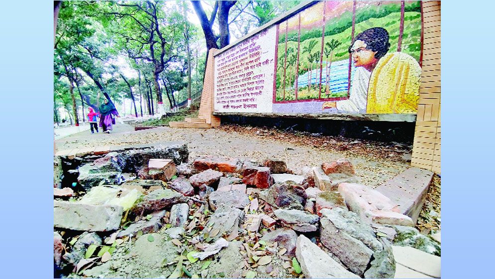 ডিসি হিলের ভেতরে কবি নজরুলের ‘বাতায়ন পাশে গুবাক তরুর সারি’ কবিতার ১২ লাইন যে দেওয়ালে লেখা, সেখানের অবস্থাও নাজুক। ময়লা-আবর্জনায় ঢেকে আছে স্থানটি। শুধু তাই নয়, ভেঙে গেছে সিঁড়ির একপাশ। এই জায়গাটুকু দেখলে যে কারও মনে হবে-কবি নজরুলকে ইচ্ছাকৃতভাবে অযত্ন করা হচ্ছে। কিন্তু এর কারণ কী হতে পারে, এমন প্রশ্ন সেখানে বেড়াতে যাওয়া সচেতন নাগরিকদের মনেও। গত বছরের জুন থেকে পরবর্তী তিন মাস ধরে ডিসি হিলের অবকাঠামো সংস্কার হয়েছে।