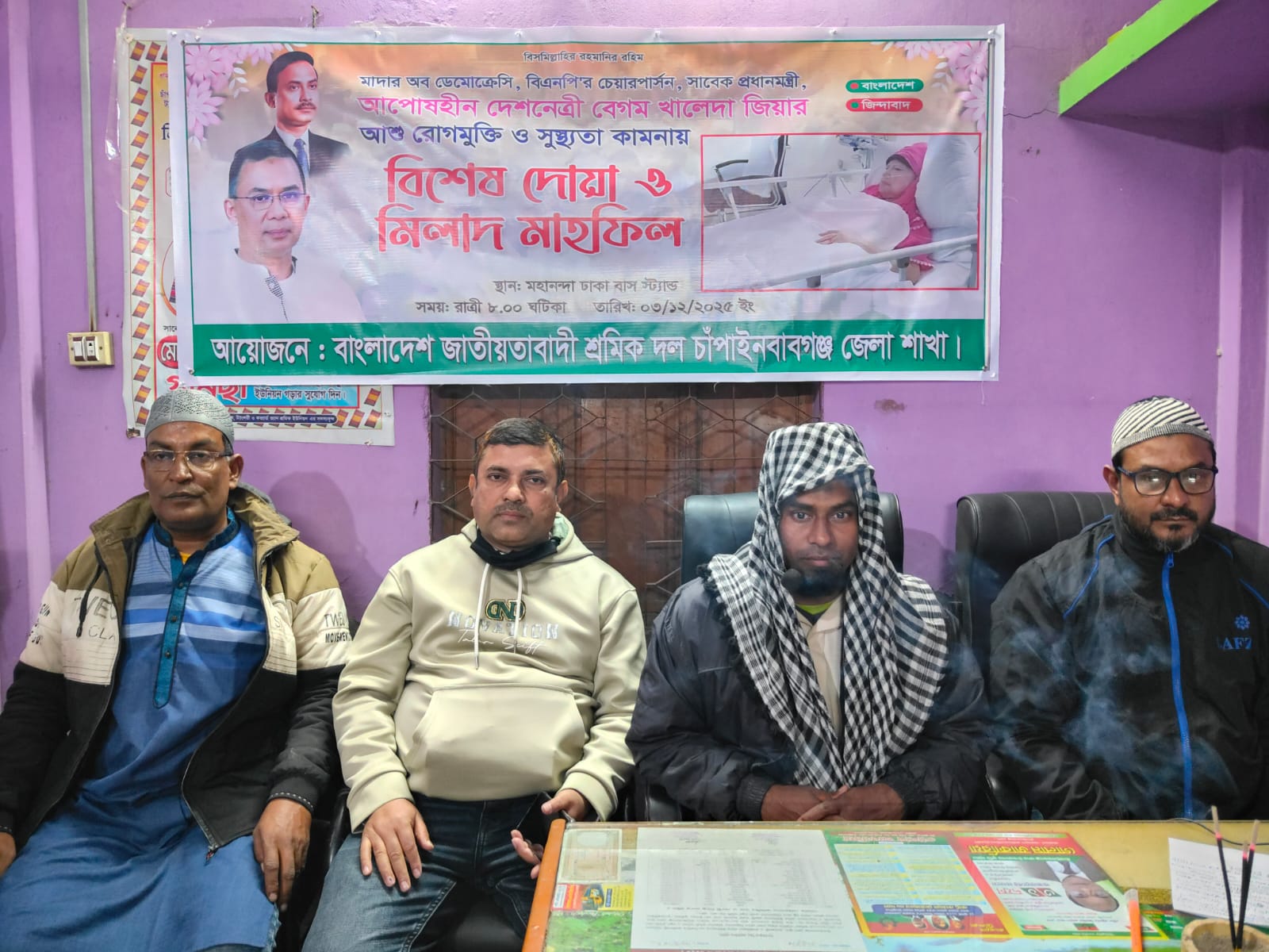 চাঁপাইনবাবগঞ্জ জেলায় বাংলাদেশ জাতীয়তাবাদী শ্রমিক দলের আয়োজনে( ৩ই ডিসেম্বর) বুধবার রাত ৮ ঘটিকায় মহানন্দা ঢাকা বাস স্ট্যান্ডে বিশেষ দোয়া ও মিলাদ মাহফিল আয়োজন করেছে। মাদার অব ডেমোক্রেসি, বিএনপির চেয়ারম্যান, সাবেক প্রধানমন্ত্রী,আপোষহীন দেশনেত্রী বেগম খালেদা জিয়ার আশু রোগমুক্তি ও সুস্থতা কামনায় চাঁপাইনবাবগঞ্জের বিএনপির শ্রমিক দলের সকল কর্মীবৃন্দ।