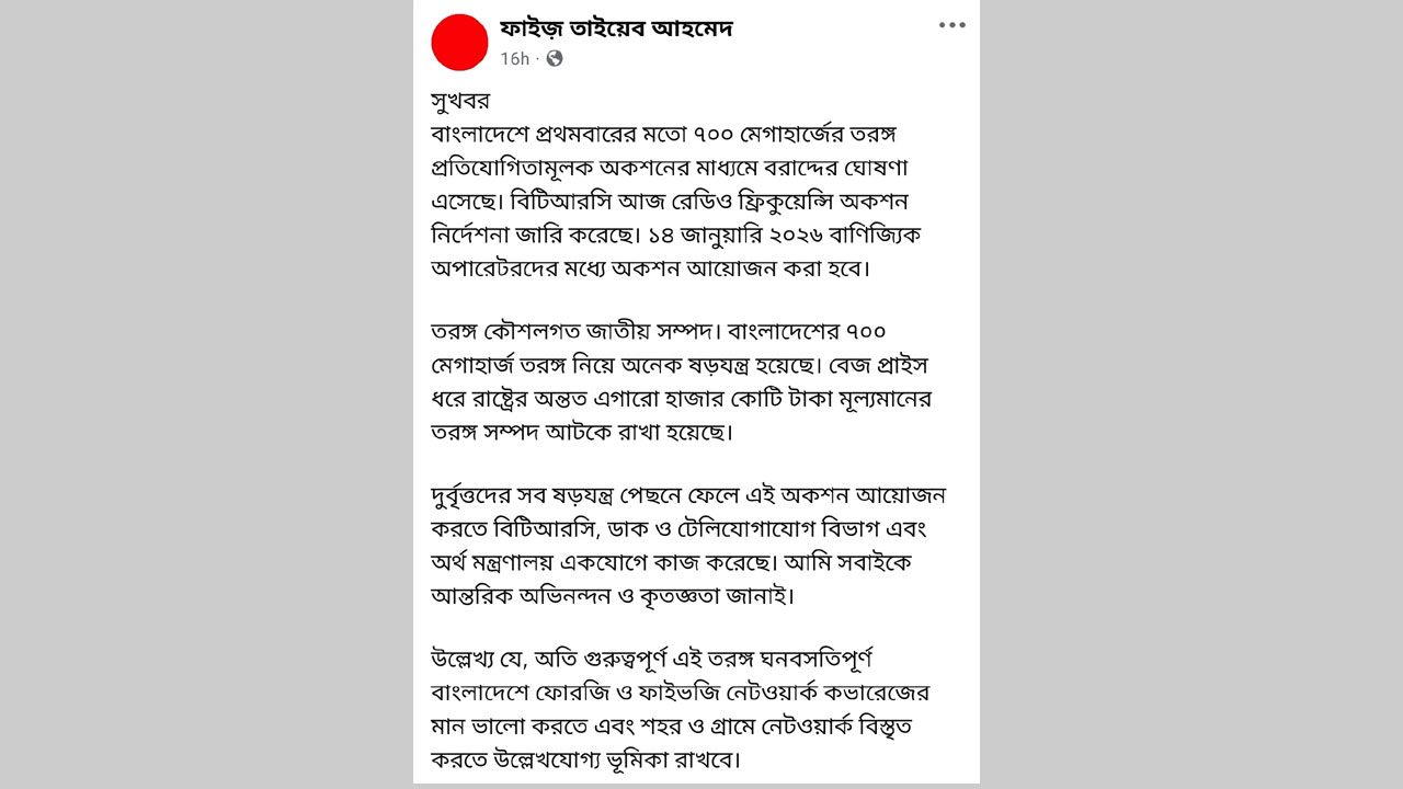 ফয়েজ আহমদ তৈয়্যব তার পোস্টে বলেন, ৭০০ মেগাহার্জ তরঙ্গ একটি কৌশলগত জাতীয় সম্পদ। এই তরঙ্গ নিয়ে দীর্ঘদিন ধরে নানা ষড়যন্ত্র হয়েছে। বেজ প্রাইস ধরে রাষ্ট্রের অন্তত ১১ হাজার কোটি টাকা মূল্যমানের তরঙ্গ সম্পদ এতদিন আটকে রাখা হয়েছিল। সব ষড়যন্ত্র পেছনে ফেলে এই অকশন আয়োজন করতে বিটিআরসি, ডাক ও টেলিযোগাযোগ বিভাগ এবং অর্থ মন্ত্রণালয় একযোগে কাজ করেছে।