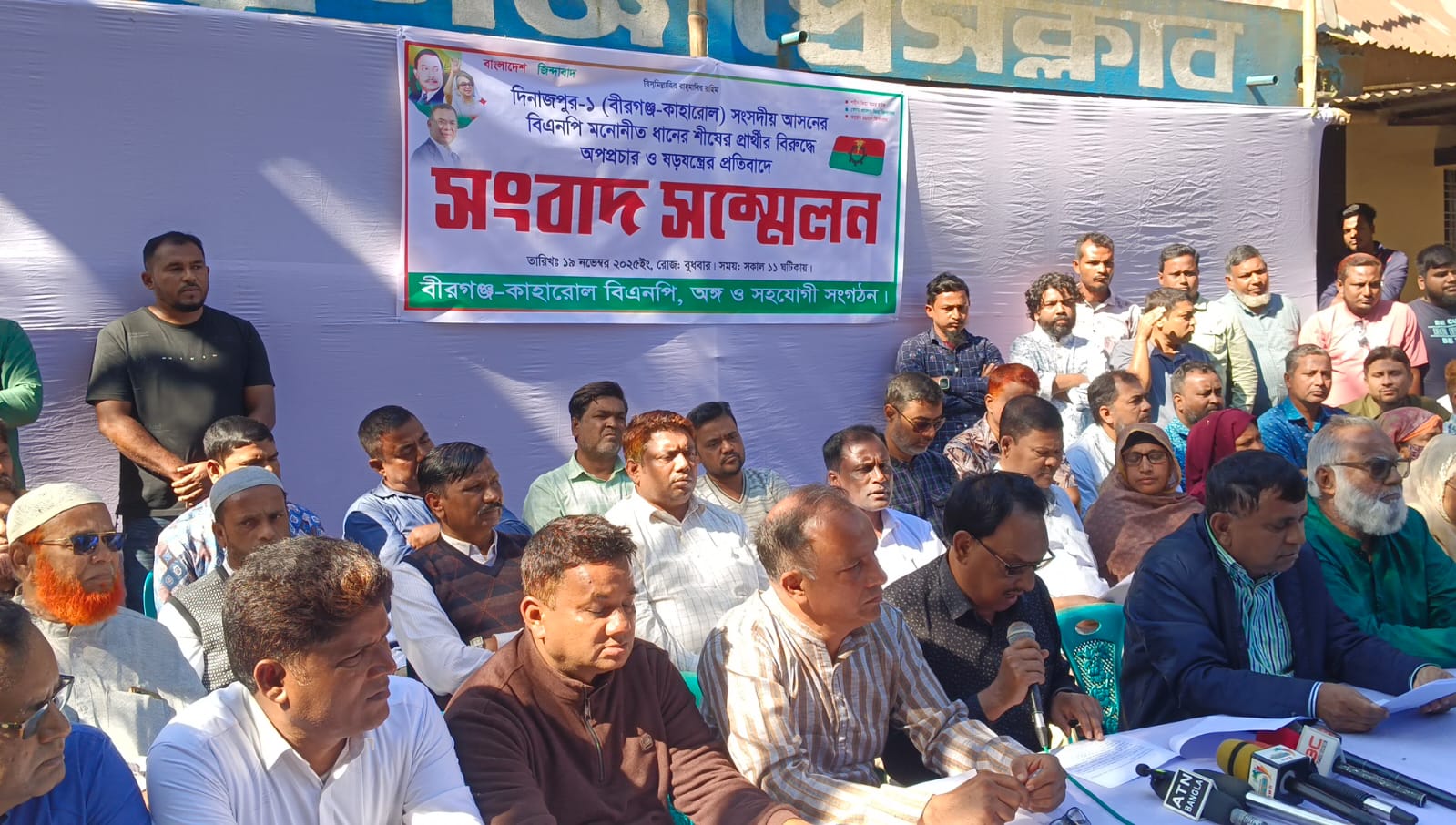 ১৯ নভেম্বর বুধবার বীরগঞ্জ প্রেসক্লাব প্রাঙ্গনে সংবাদ সম্মেলনে মাধ্যমে দিনাজপুর-১ আসন সহ দেশবাসীকে অবগত করা হয় উপজেলা বিএনপির সন্মানিত সভাপতি, জেলা বিএনপির সহ-সভাপতি, কৃষক দলের কেন্দ্রীয় কমিটির সদস্য এবং সমাগত ত্রয়োদশ জাতীয় সংসদ নির্বাচনে (বীরগঞ্জ-কাহারোল) আসনে বিএনপি মনোনীত ধানের শীষ প্রতীকের ঘোষনাকৃত প্রার্থী আলহাজ্ব মোঃ মনজুরুল ইসলাম মঞ্জু’র বিরুদ্ধে অপর মনোনয়ন প্রত্যাশী উপজেলা বিএনপির সাধারন সম্পাদক আলহাজ্ব মোঃ জাকির হোসেন ধলু’র নেতৃত্বে একটি পক্ষের গুটি কয়েক লোক দলীয় শৃঙ্খলা ভঙ্গ করে অপপ্রচার চালিয়ে যাচ্ছে এবং গত ১৭ নভেম্বর ভুয়া, ভিত্তিহীন ও ব্যক্তি আক্রোশ মুলক তথ্য দিয়ে সাংবাদিক সম্মেলন করে বিএনপির সুনাম ক্ষুন্ন করে ধানের শীষ প্রতীকের ঘোষনাকৃত প্রার্থীকে হারিয়ে প্রতিপক্ষ জামায়াত প্রার্থীকে জিতানোর চেষ্টায় লিপ্ত রয়েছে।