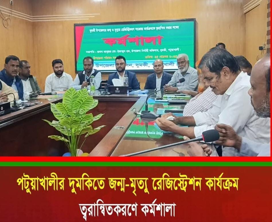 ২৫ নভেম্বর ২০২৫ইং পটুয়াখালী জেলার দুমকি উপজেলায়, জন্ম-মৃত্যু রেজিস্ট্রেশন কার্যক্রম আরও দ্রুত ও সহজ করতে উপজেলা পর্যায়ের এক আলোচনা সভা অনুষ্ঠিত হয়েছে। মঙ্গলবার সকালে উপজেলা পরিষদ সভাকক্ষে এ সভা অনুষ্ঠিত হয়।
