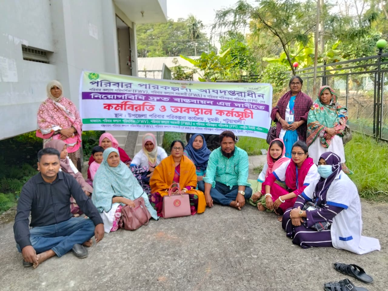 পরিবার কল্যাণ সহকারী (FWA) দের নিয়োগবিধি দ্রুত বাস্তবায়নের দাবিতে পটুয়াখালী জেলার দুমকি উপজেলায় কর্মবিরতি ও অবস্থান কর্মসূচি অনুষ্ঠিত হয়েছে।