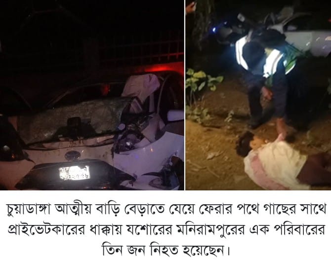 চুয়াডাঙ্গা আত্মীয় বাড়ি বেড়াতে যেয়ে ফেরার পথে গাছের সাথে প্রাইভেটকারের ধাক্কায় যশোরের মনিরামপুর উপজেলায় এক পরিবারের তিন জন নিহত হয়েছেন।