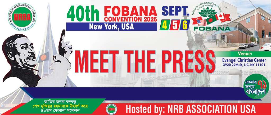 আজ বুধবার,১লা এপ্রিল ২০২৬, সন্ধ্যা ৮ টায় নিউইয়র্কের জ্যাকসন হাইটসের সানাই রেস্টুরেন্টের মিলনায়তনে এক সংবাদ সম্মেলন অনুষ্ঠিত হবে ।৪০তন ফোবানা সম্মেলন উপলক্ষে ।