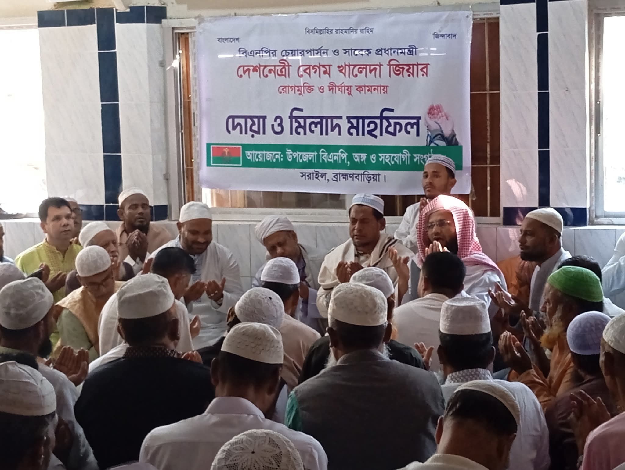 মাহফিলে দোয়া পরিচালনা করেন সরাইল বিকাল বাজার শাহী মসজিদের খতিব মাওলানা খালেদ সাইফুল্লাহ।