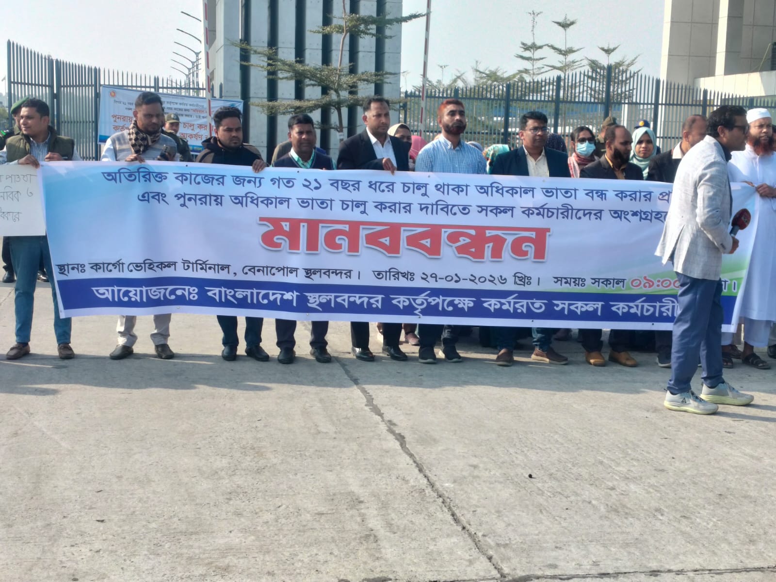 অধিকাল ভাতা বন্ধের প্রতিবাদে বেনাপোলে বন্দর কর্মচারীদের মানব বন্ধনে আজ একঘন্টা বন্ধ ছিল আমদানি,রফতানি ও বন্দর থেকে পণ্য খালাস কার্যক্রম।