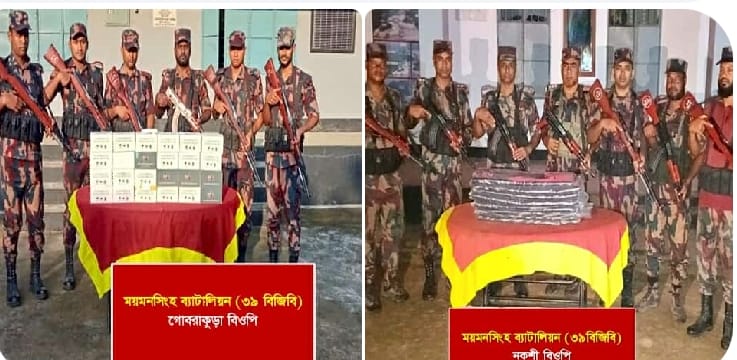 ময়মনসিংহ ব্যাটালিয়ন ৩৯ বিজিবি'র পৃথক অভিযানে ময়মনসিংহের হালুয়াঘাট ও শেরপুরের ঝিনাইগাতী সীমান্ত এলাকা থেকে বিপুল পরিমাণ ভারতীয় মোবাইল ডিসপ্লে ও গজ কাপড় জব্দ করা হয়েছে।