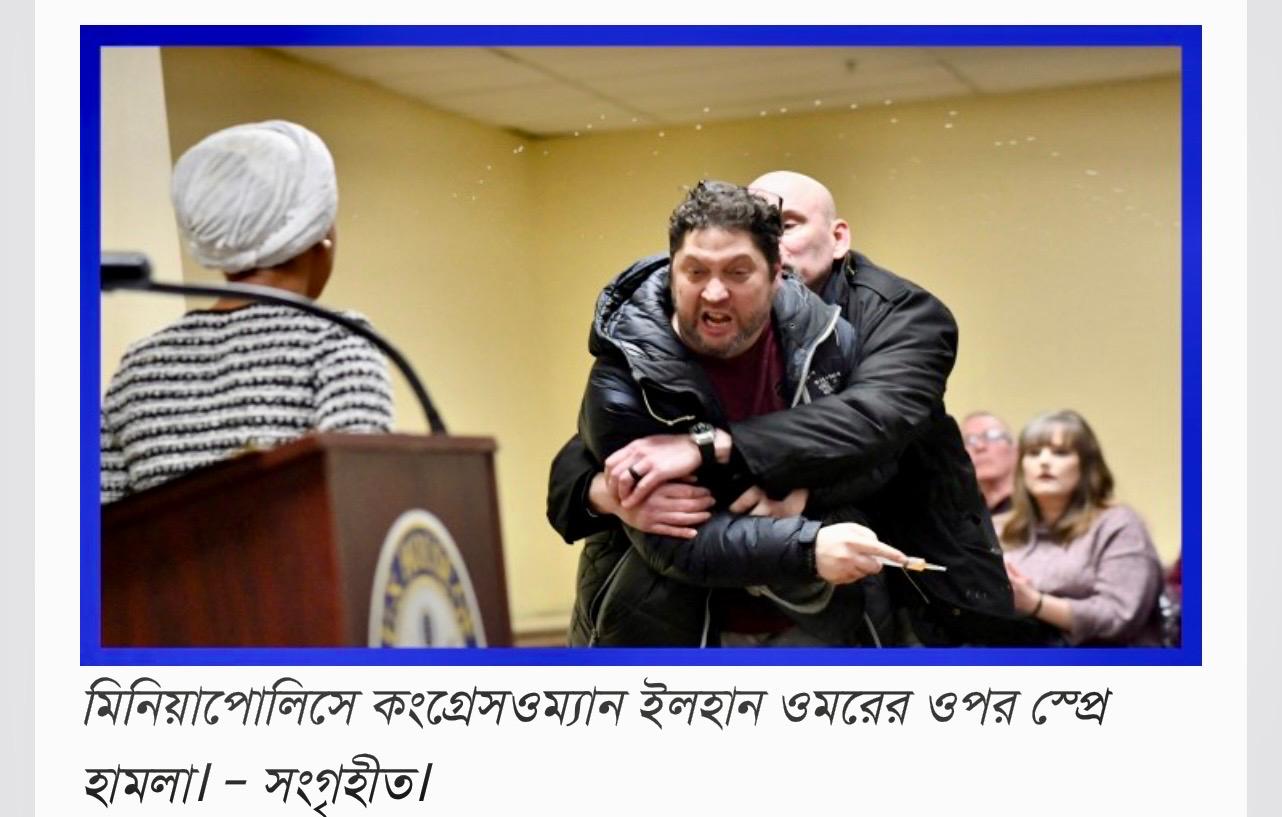 যুক্তরাষ্ট্রের মিনিয়াপোলিসে একটি টাউন হল সভা চলাকালে ডেমোক্রেট ও মুসলিম কংগ্রেসওম্যান ইলহান ওমারের ওপর স্প্রে (তরল পদার্থ) হামলা হয়েছে। ২৭ জানুয়ারি মঙ্গলবার রাতে উত্তর মিনিয়াপোলিসের একটি কমিউনিটি সেন্টারে আয়োজিত এই সভায় উপস্থিত এক ব্যক্তি সিরিঞ্জ ব্যবহার করে তীব্র গন্ধযুক্ত স্প্রে ছিটিয়ে দেন বলে জানিয়েছে প্রত্যক্ষদর্শীরা।খবর আইবিএননিউজ।