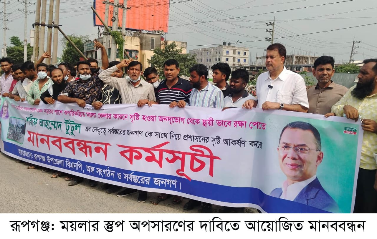 গতকাল ১৫অক্টোবর বুধবার রূপগঞ্জ উপজেলা বিএনপি, অঙ্গ ও সহযোগী সংগঠনের উদ্যোগে গোলাকান্দাইল গোলচত্বরে এ মানববন্ধন কর্মসূচি পালন করা হয়। মানববন্ধন পূর্বক আয়োজিত সভায় সভাপতিত্ব করেন নারায়ণগঞ্জ জেলা ছাত্রদলের সাবেক সহ-সভাপতি মাসুদুর রহমান।