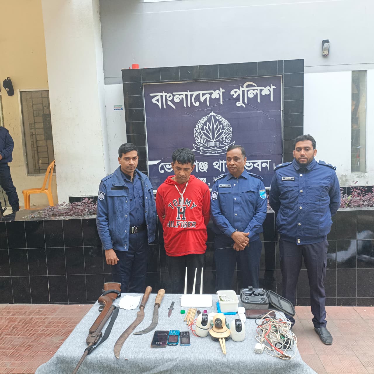 শরিয়তপুরের ভেদরগঞ্জ উপজেলার কার্তিকপুর এলাকা থেকে শির্ষ সন্ত্রাসী ফুয়াদ সরকার ( আহসান উল্যাহ,) একটি এয়ারগান, দেশীয় অস্ত্র এবং মাদকেদ্রব্য ব্যাবহারের বিভিন্ন সরঞ্জাম সহ গ্রেফতার করে বাংলাদের যৌথবাহিনী।