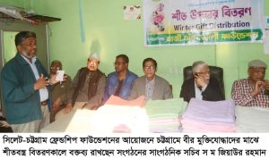 সিলেট-চট্টগ্রাম ফ্রেন্ডশীপ ফাউন্ডেশনের উদ্যোগে ও হাজী চাঁন্দ আলী ফাউন্ডেশনের সহযোগিতায় ১২ জানুয়ারি, সোমবার, বিকাল চারটায় নগরীর পশ্চিম খুলশী জালালাবাদ হাউজিং সোসাইটির মুক্তিযোদ্ধা কলোনীতে বীর মুক্তিযোদ্ধা প্রগতি সমবায় সমিতি লিমিটেডের কার্যালয়ে বীর মুক্তিযোদ্ধাদের মাঝে শীতবস্ত্র বিতরণ করা হয়।