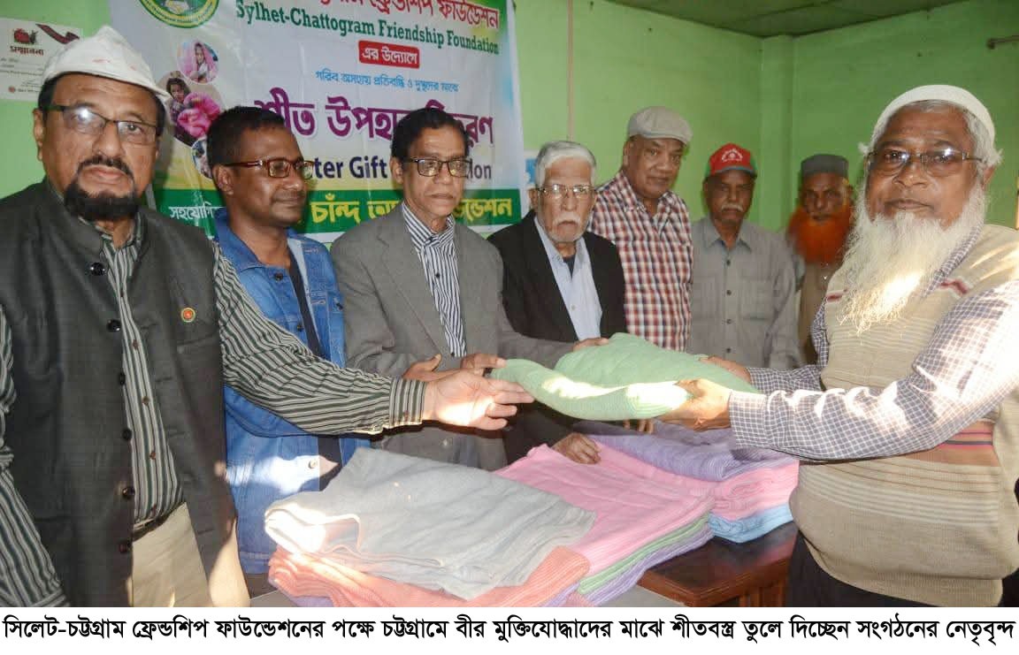 সিলেট-চট্টগ্রাম ফ্রেন্ডশীপ ফাউন্ডেশনের উদ্যোগে ও হাজী চাঁন্দ আলী ফাউন্ডেশনের সহযোগিতায় ১২ জানুয়ারি, সোমবার, বিকাল চারটায় নগরীর পশ্চিম খুলশী জালালাবাদ হাউজিং সোসাইটির মুক্তিযোদ্ধা কলোনীতে বীর মুক্তিযোদ্ধা প্রগতি সমবায় সমিতি লিমিটেডের কার্যালয়ে বীর মুক্তিযোদ্ধাদের মাঝে শীতবস্ত্র বিতরণ করা হয়।