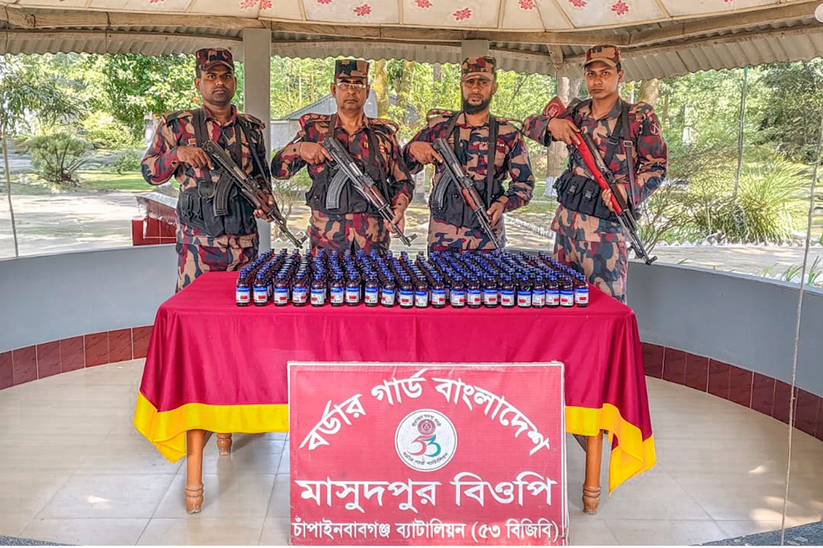 চাঁপাইনবাবগঞ্জ ব্যাটালিয়ান ৫৩ বিজিবি'র অধীনস্থ মাসুদপুর বিওপির ০১টি বিশেষ টহল শিবগঞ্জ থানাধীন মনাকষা ইউনিয়নের ঠুঠাপাড়া গ্রামে অভিযান চালিয়ে ২৭৮ বোতল ভারতীয় নেশাজাতীয় চকোপ্লাস সিরাপ জব্দ করে এবং মনাকষা বিওপি’র ০১টি বিশেষ টহল শিবগঞ্জ থানাধীন মনাকষা ইউনিয়েনের পারচৌকা গ্রামে অভিযান চালিয়ে ভারতীয় ১৫৯ বোতল নেশাজাতীয় এস্কাফ সিরাপ জব্দ করে, যার মোট বাজার মূল্য আনুমানিক ০২ লক্ষ টাকা। জব্দকৃত নেশাজাতীয় সিরাপ শিবগঞ্জ থানায় জমা করা হয়েছে। এই বিষয়ে চাঁপাইনবাবগঞ্জ ব্যাটালিয়ন (৫৩ বিজিবি) এর অধিনায়ক লেফটেন্যান্ট কর্নেল কাজী মুস্তাফিজুর রহমান, পিএসসি এ বিষয়ের সত্যতা নিশ্চিত করে বলেন, ব্যাটালিয়নের দায়িত্বপূর্ণ এলাকায় সীমান্ত সুরক্ষা সহ যেকোনো ধরনের অবৈধ কার্যক্রম রোধে বিজিবি সবসময় তৎপর রয়েছে
