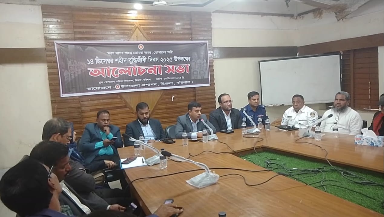 বরিশাল জেলার হিজলা উপজেলায় উপজেলা প্রশাসন কর্তৃক আয়োজিত ১৪ ডিসেম্বর শহীদ বুদ্ধিজীবী দিবস২০২৫, সকাল ১০ টায় উপজেলা অডিটোরিয়াম হল রুম উপজেলা নির্বাহী কর্মকর্তা মোঃ ইলিয়াস শিকদারের সভাপতিত্বে আলোচনা সভা অনুষ্ঠিত হয় সবার বক্তব্য রাখেন উপজেলা সহকারী কমিশনার ভূমি অভ্র বড়াল জ্যোতি, হিজলা থানা অফিসার ইনচার্জ মোহাম্মদ আদিল হোসেন,উপজেলা কৃষি কর্মকর্তা আহসান হাবীব আল আজাদ জনি উপজেলা প্রকৌশলী অধিদপ্তরের সুকদেব বিশ্বাস, বাংলাদেশ জামায়াতে ইসলামীর আমির অধ্যাপক নুরুল আমিন ও ভাষা সৈনিক নায়েব আব্দুল কুদ্দুস সহ উপজেলার বিভিন্ন দপ্তরের কর্মকর্তা বৃন্দ।